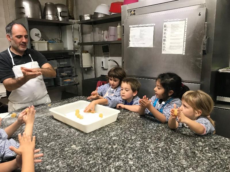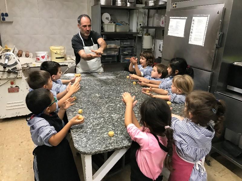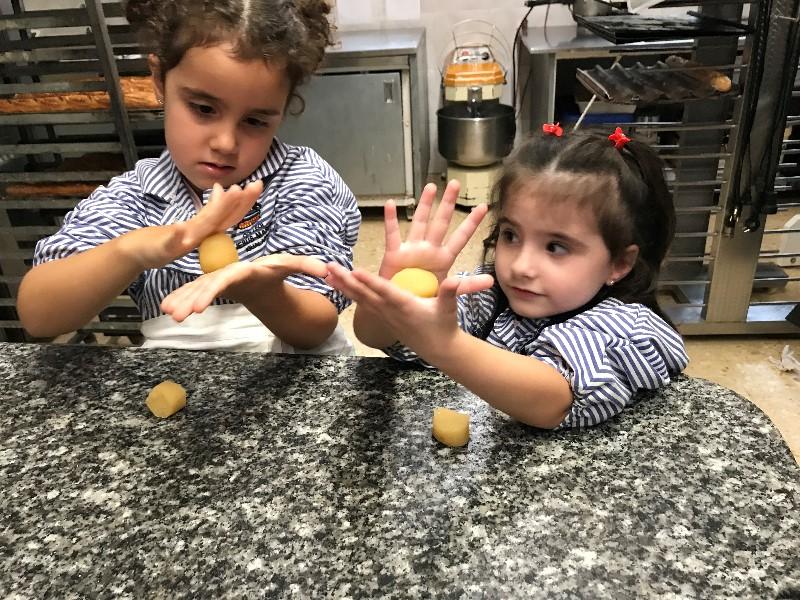 Amb les mans ben netes i el davantal posat, vam anar a l’obrador de l’Òscar pastisser, on ens va ensenyar com es fan els panellets. Amb la massa feta, vam fer unes boletes que desprès vam decorar amb cireres i xocolata.