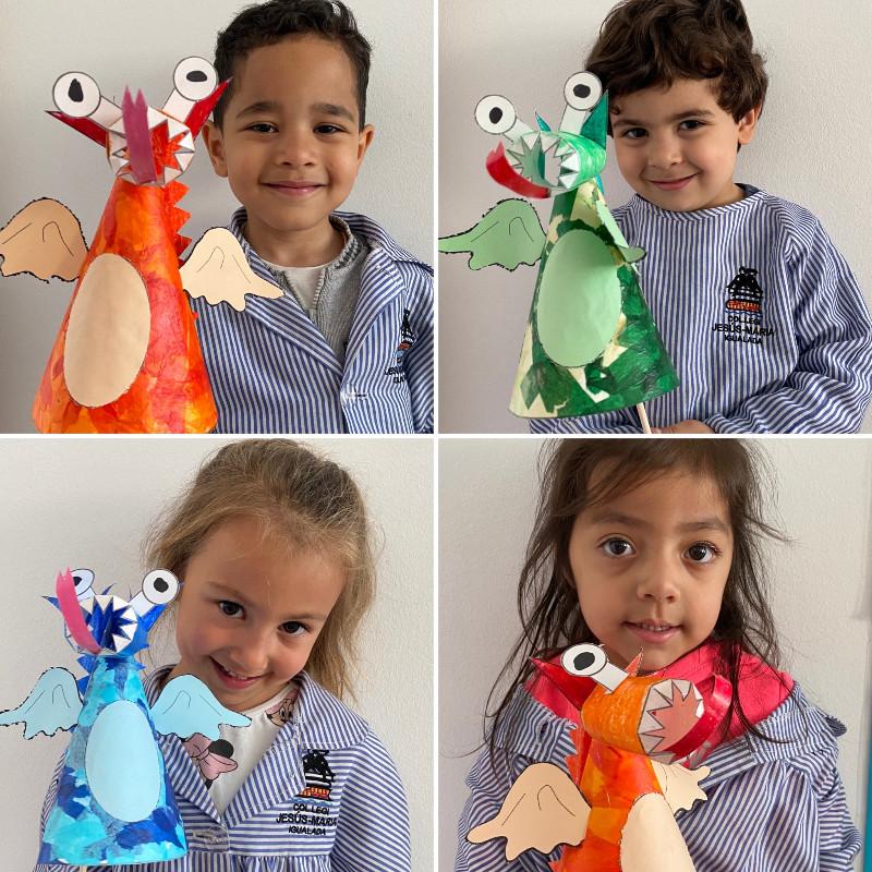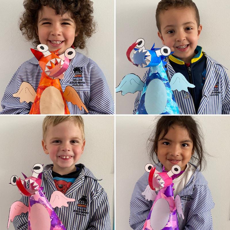 Desprès d’explicar diferents versions de la llegenda de sant Jordi i conèixer una mica més en que consisteix aquesta celebració hem fet una ROSA amb material reciclat i una titella del personatge més ferotge: EL DRAC. Mireu mireu,…