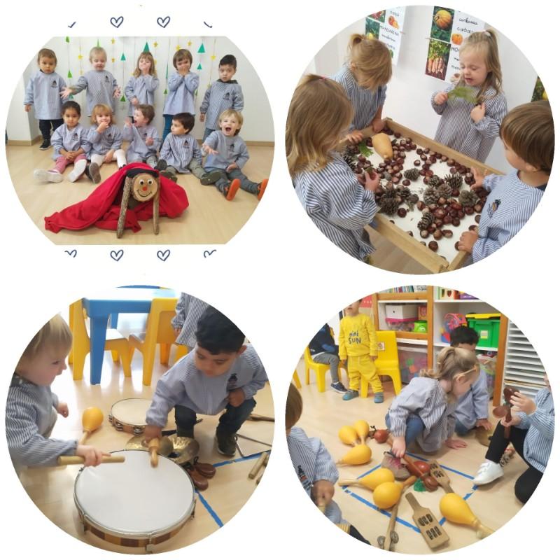 Durant molts dies, hem treballat la tardor, amb diferents activitats, com amb la manipulació de fulles, castanyes… Fent un tast de les fruites de la tardor, com la poma, la taronja, la mandarina, la magrana... Cantant i ballant cançons de l'època com la castanyera, el marrameu, cauen les fulles…